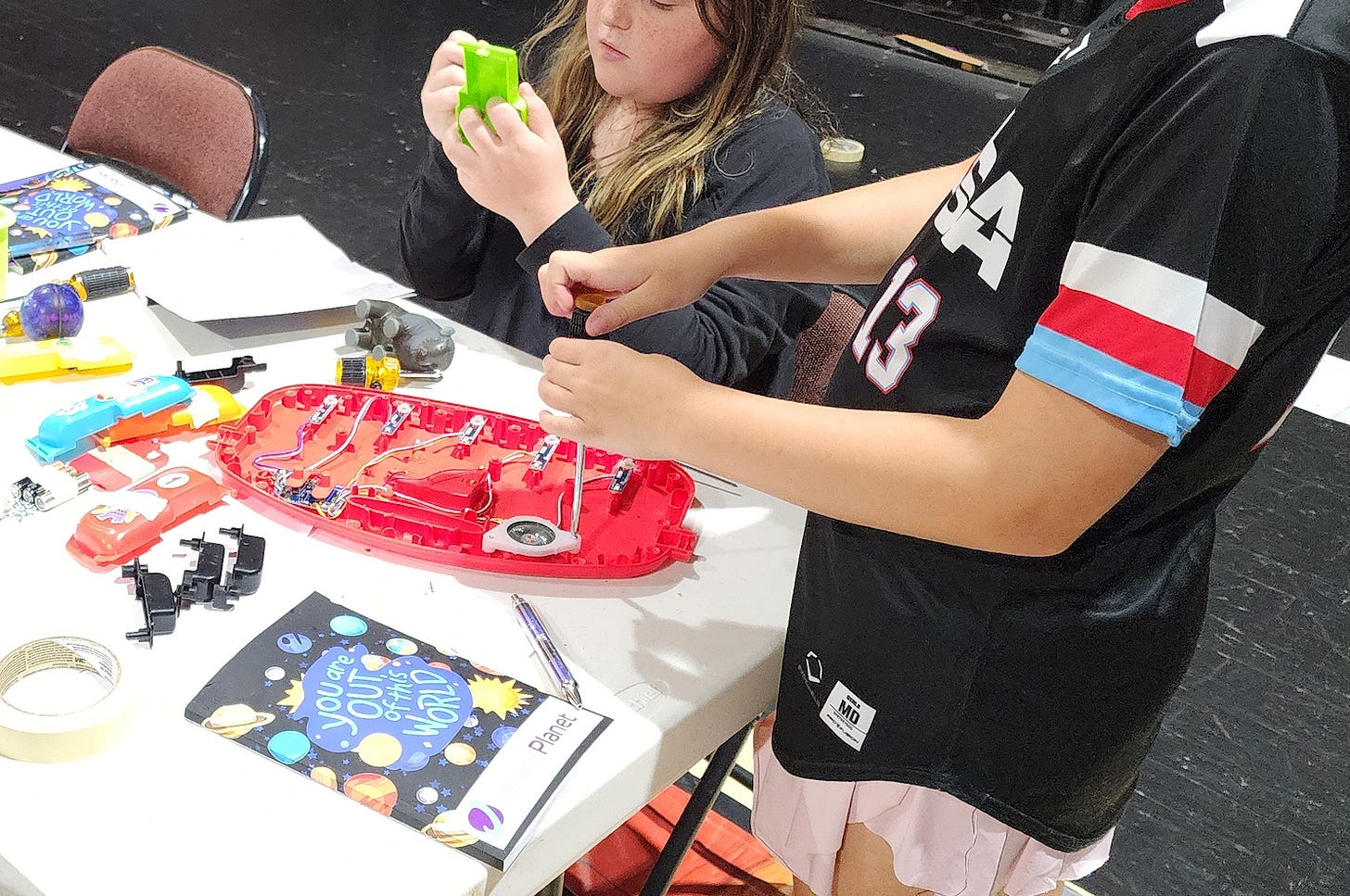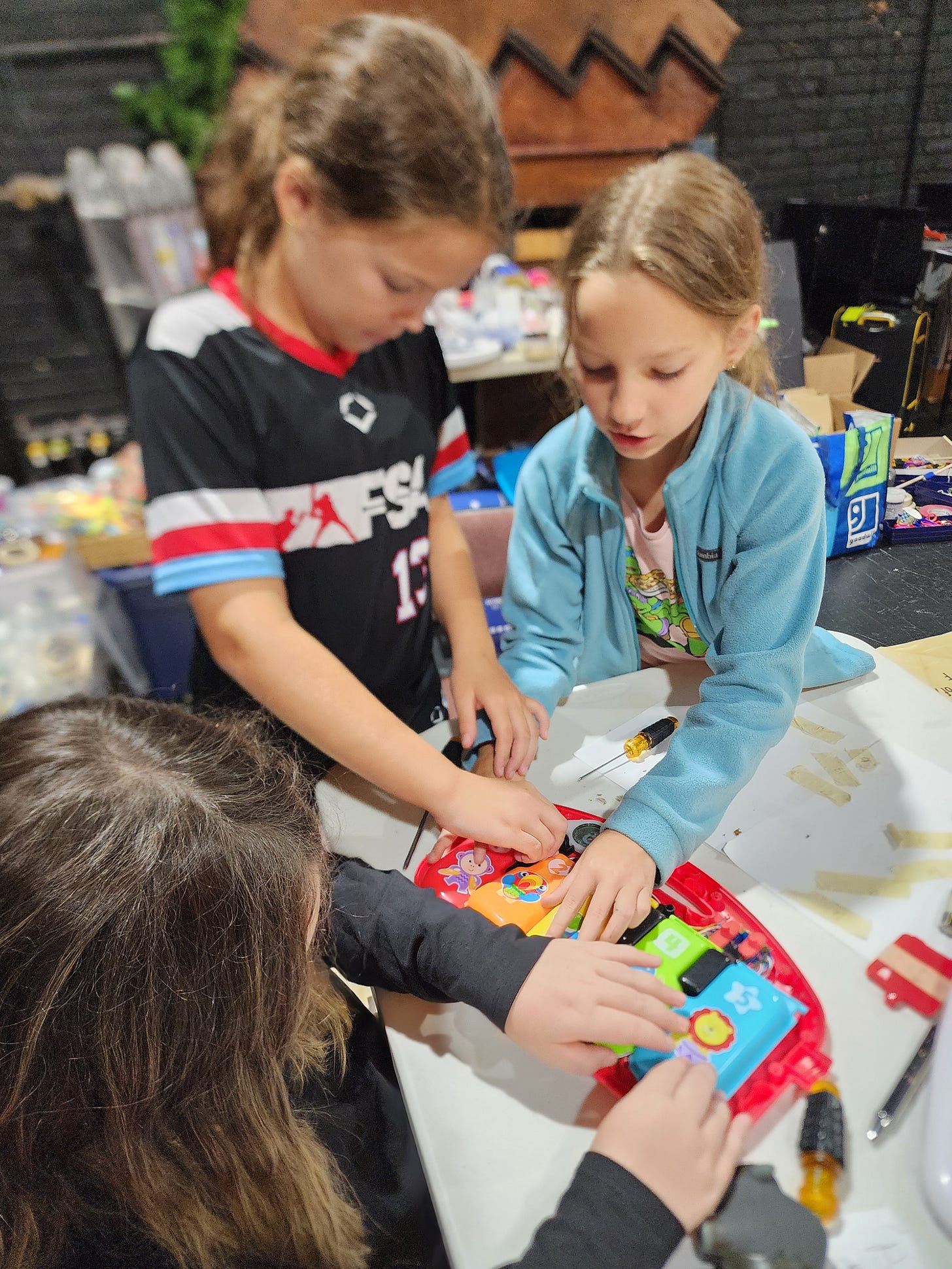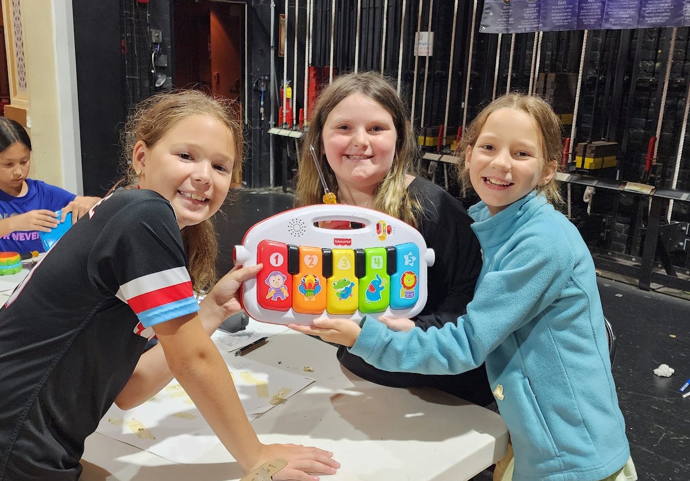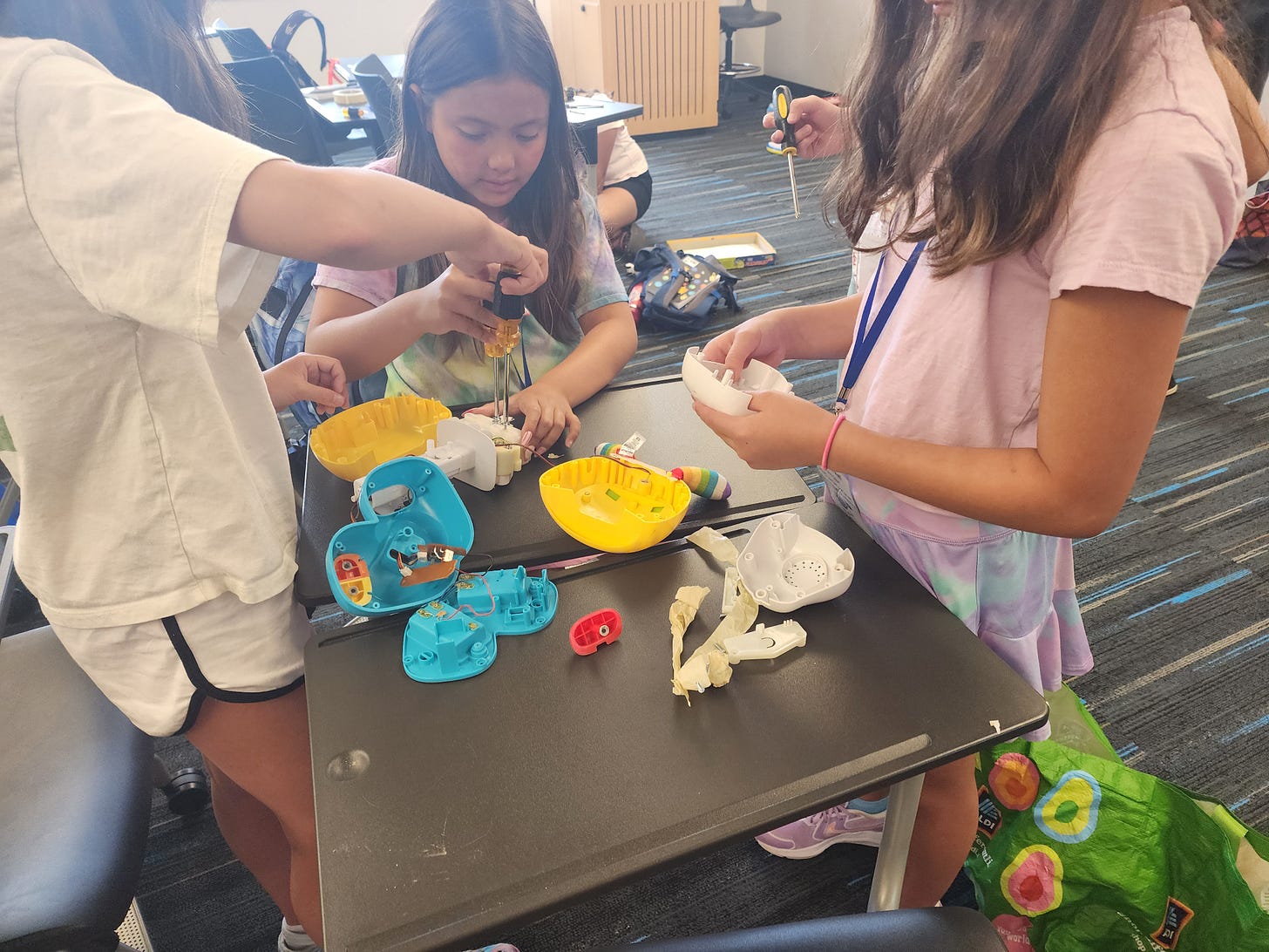 My favorite moment? Three girls, ages 9, 10, and 11, deconstructed a toy piano, found a depressed button, fixed it, and reassembled the instrument. We put batteries in and much to my and THEIR SURPRISE!…It played again, and they absolutely lit up with JOY!. The act of entrusting them with tools—and a challenge—was the spark. It wasn’t the piano that changed; it was their sense of themselves.